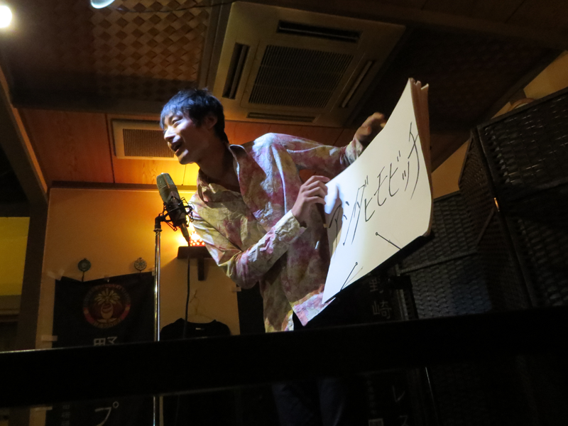 右奥に背景と同化しているのは、初日、僕と一緒にMCをしたシンガーソングライター(自称)のTU-KO。10ヶ月ぶりぐらいに会った。